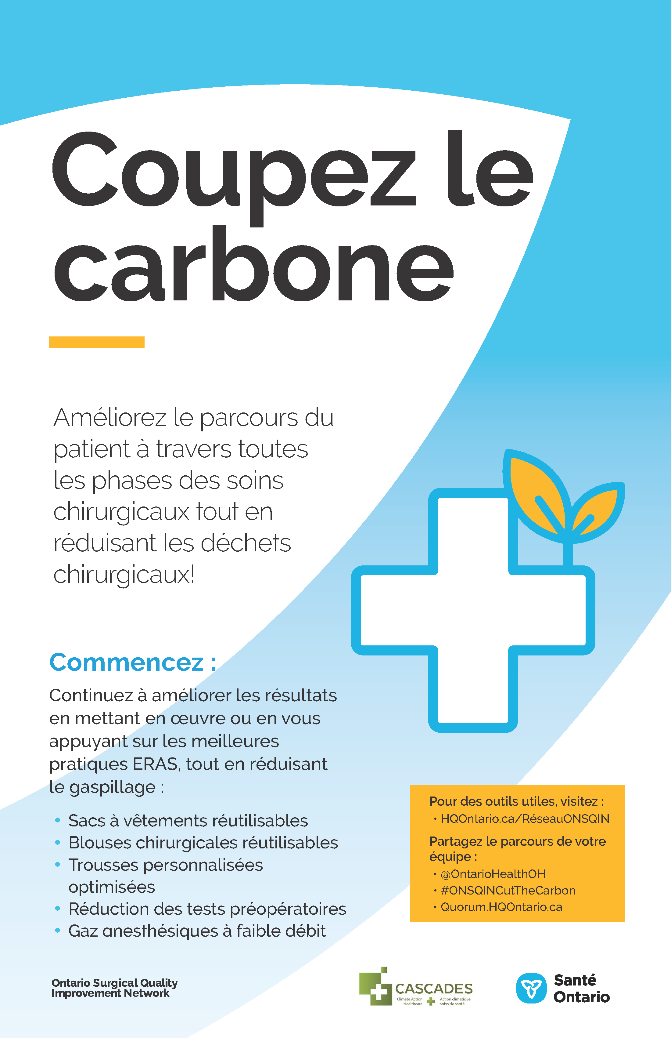 Pour de plus amples renseignements sur la campagne « Cut the Carbon: Reducing Surgical Waste » (« Limiter les émissions de carbone : réduire le volume de déchets chirurgicaux ») ou pour rejoindre le réseau d’amélioration de la qualité des soins chirurgicaux en Ontario, envoyez un courriel à l’adresse ONSQIN@ontariohealth.ca.