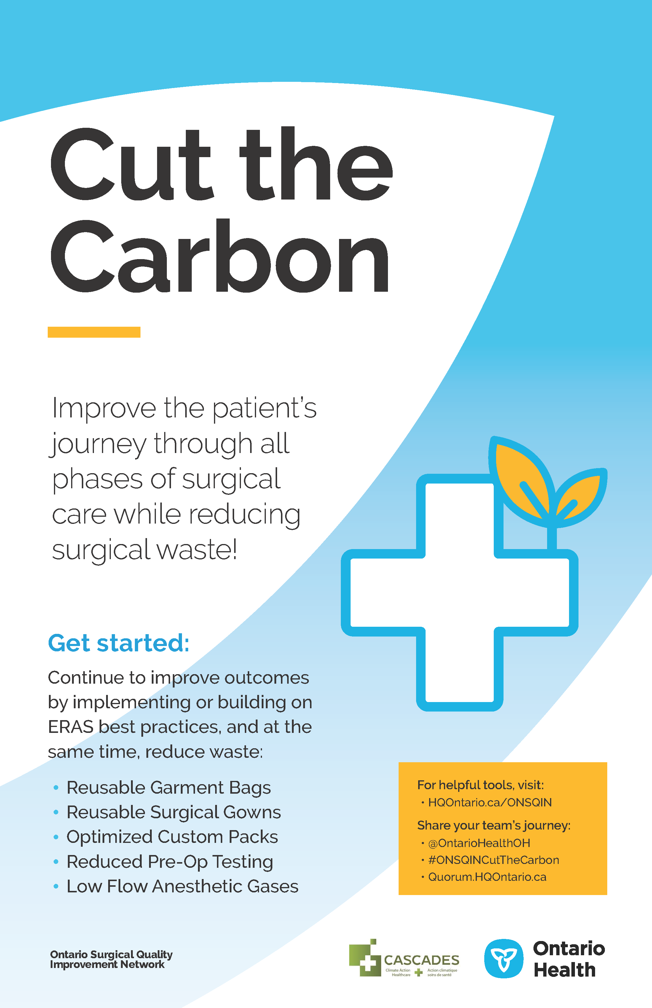 For more information on the Cut the Carbon: Reducing Surgical Waste campaign or to join the Ontario Surgical Quality Improvement Network, please contact ONSQIN@ontariohealth.ca.